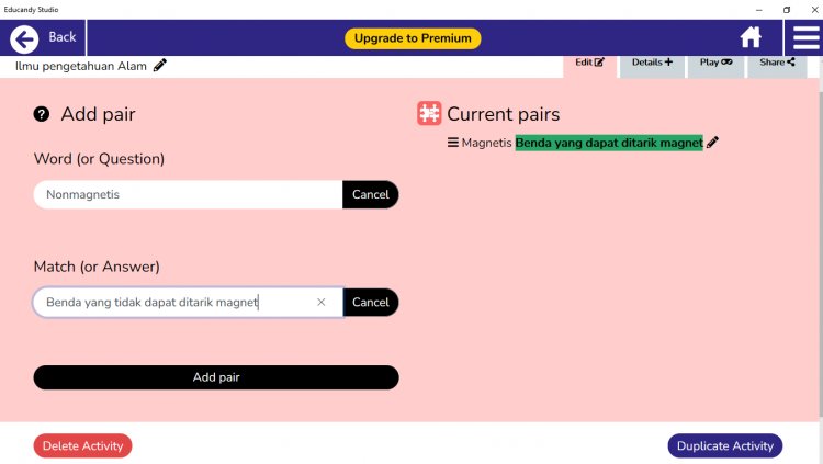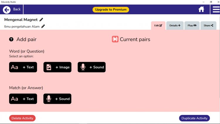 b. Untuk membuat permainan matching pairsklik matching pairs, akan muncul dua kotak kosong seperti pembuatan words, isi, klik Isi kotak putih bertuliskan word (question) dengan pertanyaan, dan match (answer) dengan jawaban, klik add pair, lakukan berulang kali minimal sembilan pasang pertanyaan dan jawaban. Setelah selesai, scroll ke bawah sehingga ada tulisan play activity, maka pasangan pertanyaan dan jawaban yang sudah dibuat, dapat dimainkan dengan lima cara yaitu noughts & crosses, crosswords, match-up, memory dan multiple choice, seperti berikut ini: