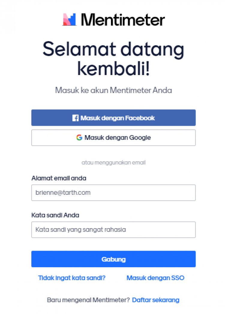 1. Akses ke mentimeter dengan alamat mentimeter.com dan daftar dengan klik sign up. Jika Bapak/Ibu memiliki aku gmail silahkan sign up dg akun google supaya lebih mudah, lalu pilih akun gmali yang akan digunakan.